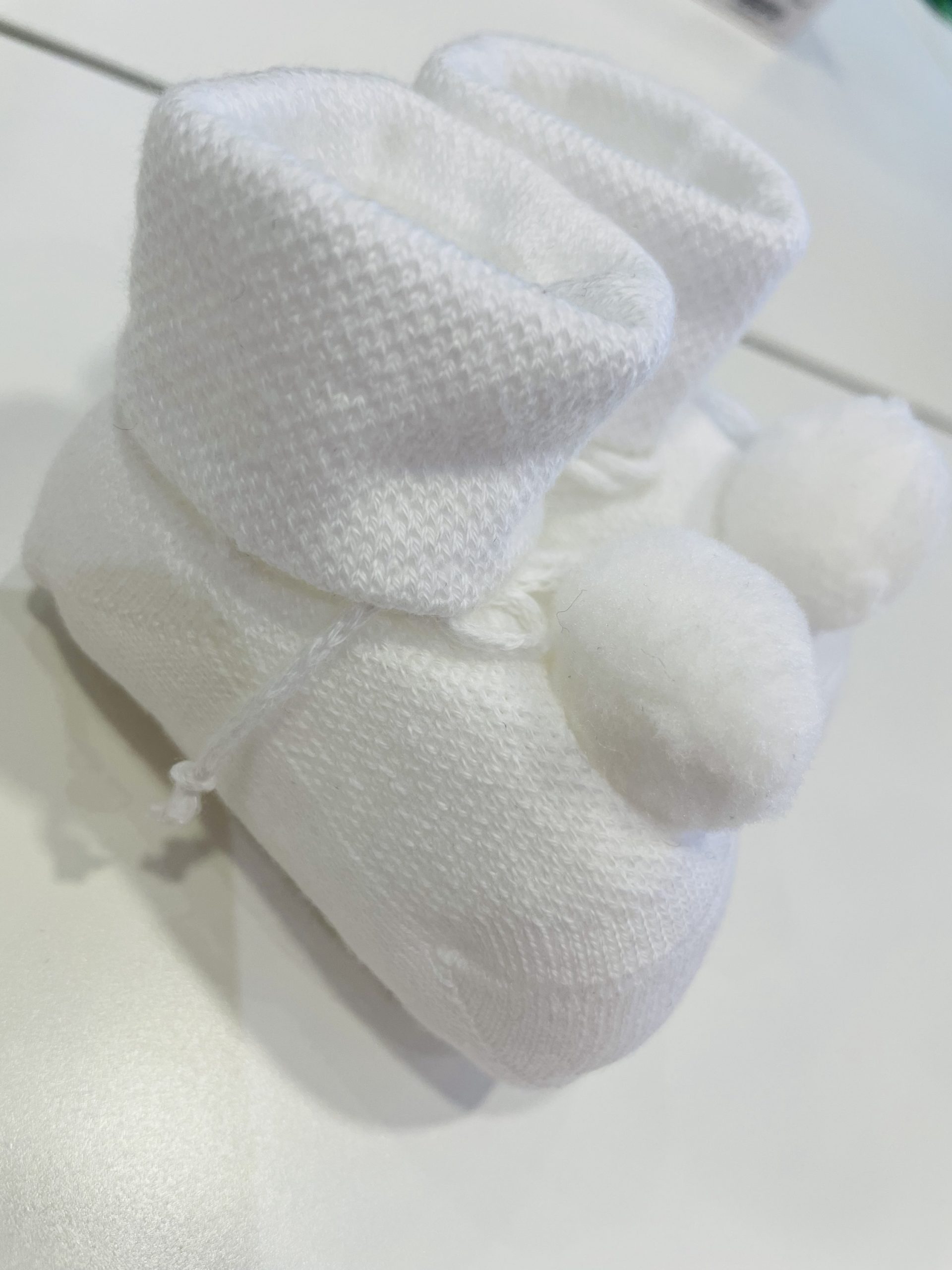 Scarpina neonato a calzino impreziosita con un pon pon ed un laccetto. Unisex
